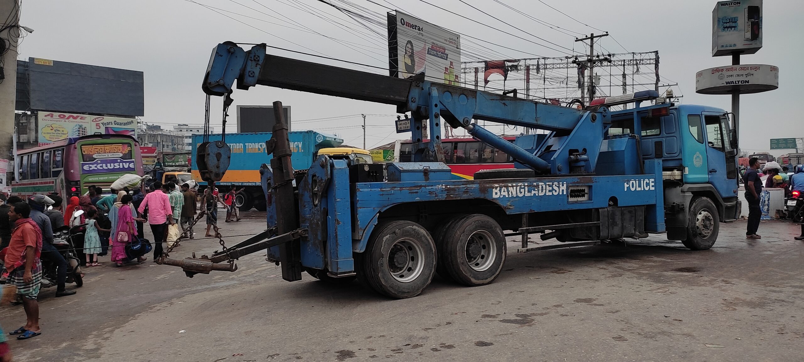 মঙ্গরবার (০১ মে) সন্ধ্যায় ক্যামেরায় ধরা পরে এই দৃশ। দেখা যায়, বাইপাইল-আব্দুল্লাপুর মহাসড়কের প্রবেশ মুখ বাইপাইল এলাকায় পুলিশের রেকার দিয়ে পরিবহন ঢুকতে বাধা দেওয়া হচ্ছে।